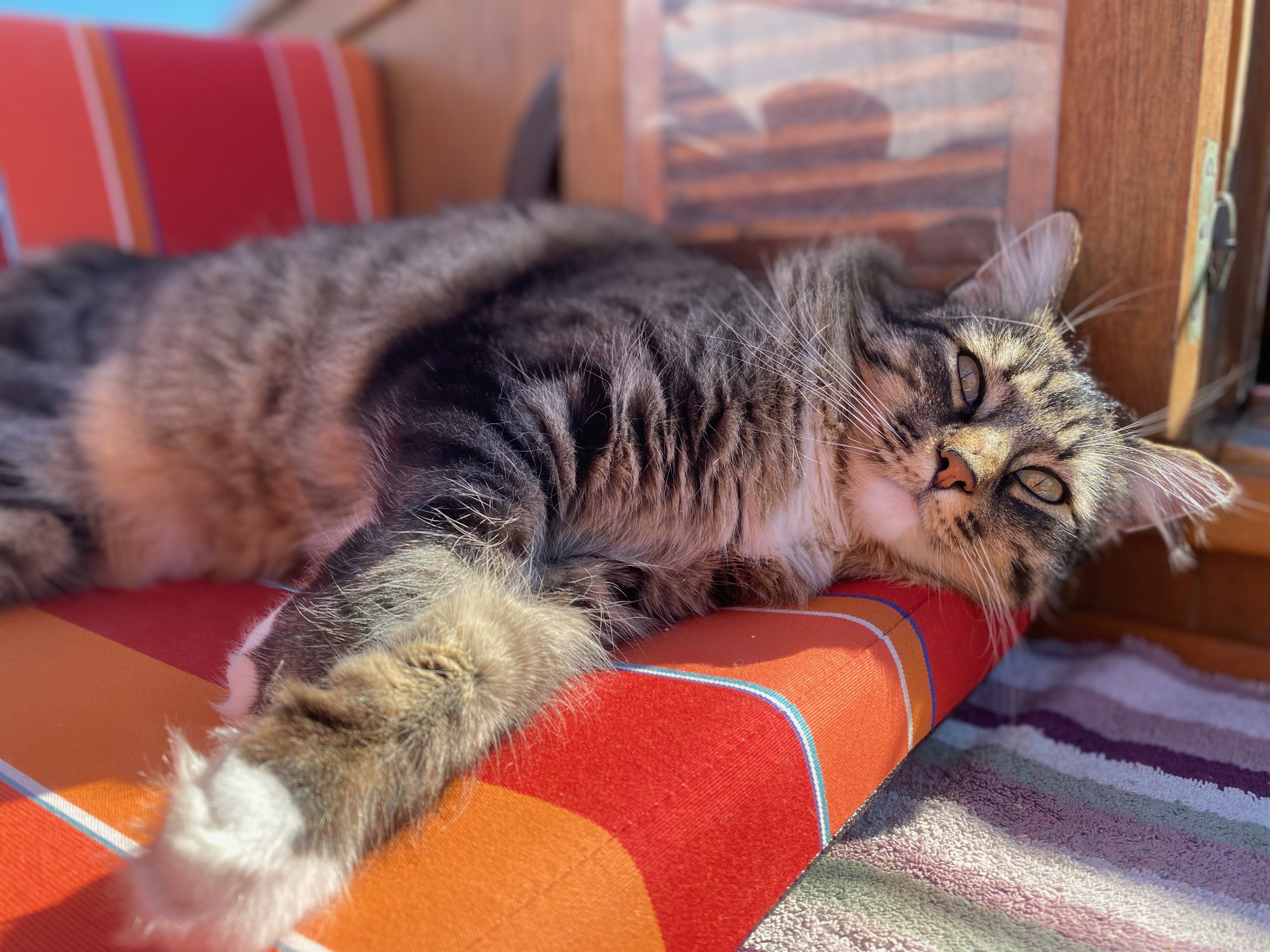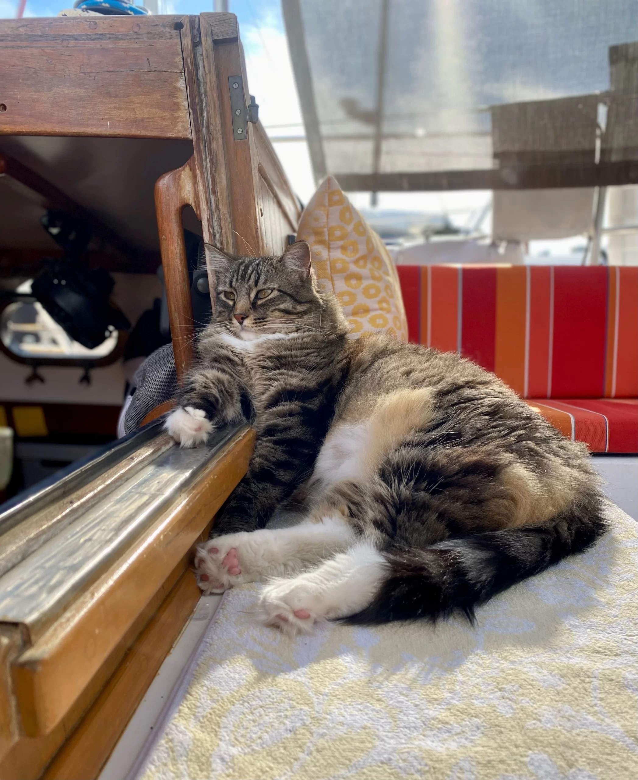 Twitchell turned up at the marina in the winter of 2015 and became the marina’s second cat. She and I always hung out together in the marina gym. Shortly after Suki passed, she started coming to our boat to say hi. By 2021 she managed to make herself right at home and was living aboard full time. Now it appears we have another cat.