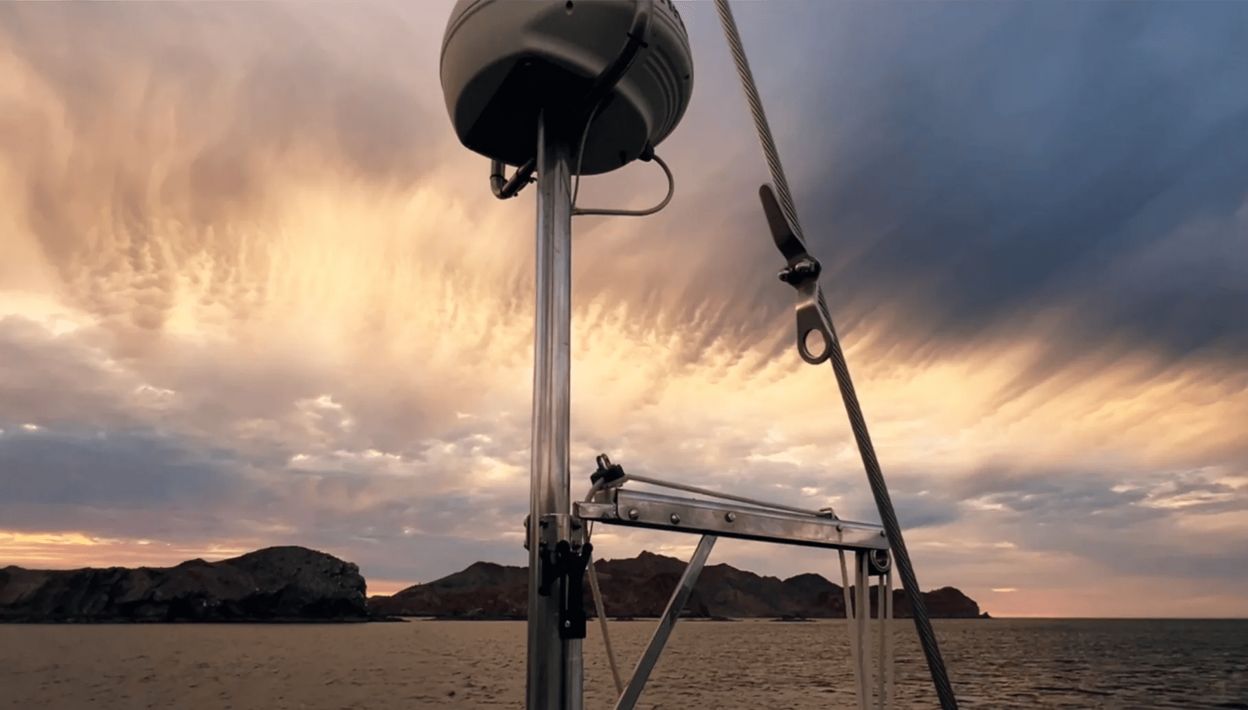 To make matters worse, our dinghy was side-tied out of the water on the starboard side. In the howling wind and steep chop, it was swinging dangerously and threatening to hit the spreaders on the mast. Rich went forward—getting completely soaked in the process—and managed to secure it as best he could. Once we cleared the channel, we motored directly into the wind and waves, aiming for the lee of the mountains on the Baja shore.