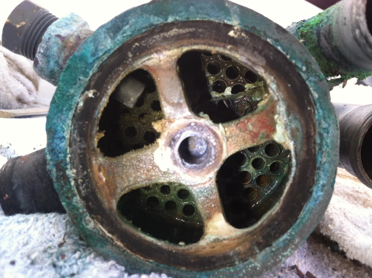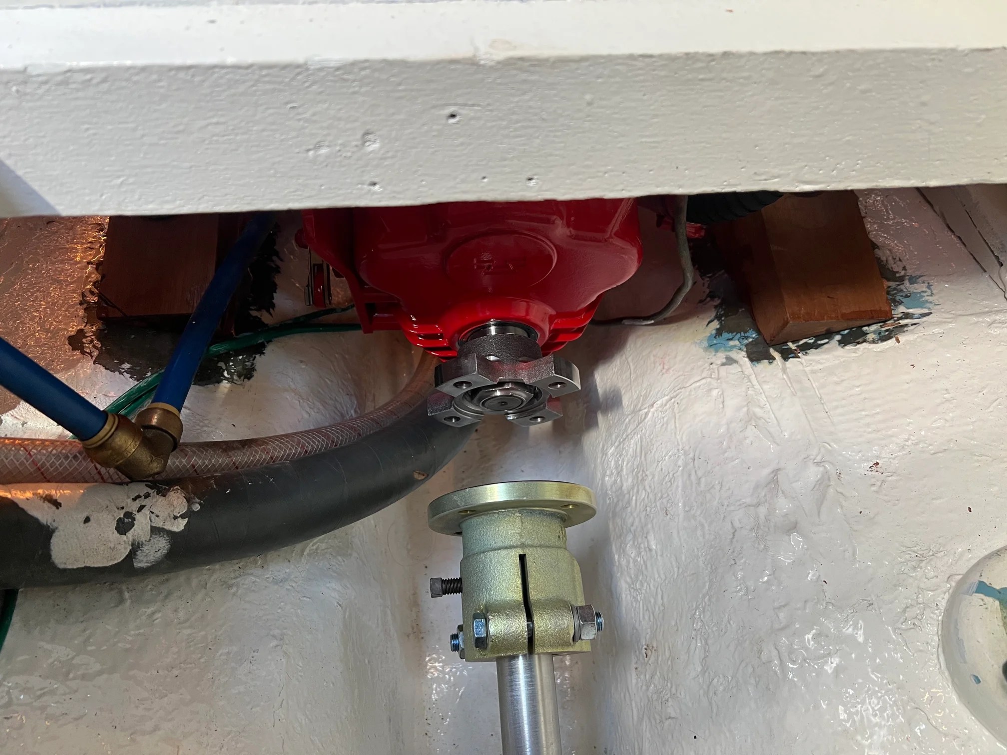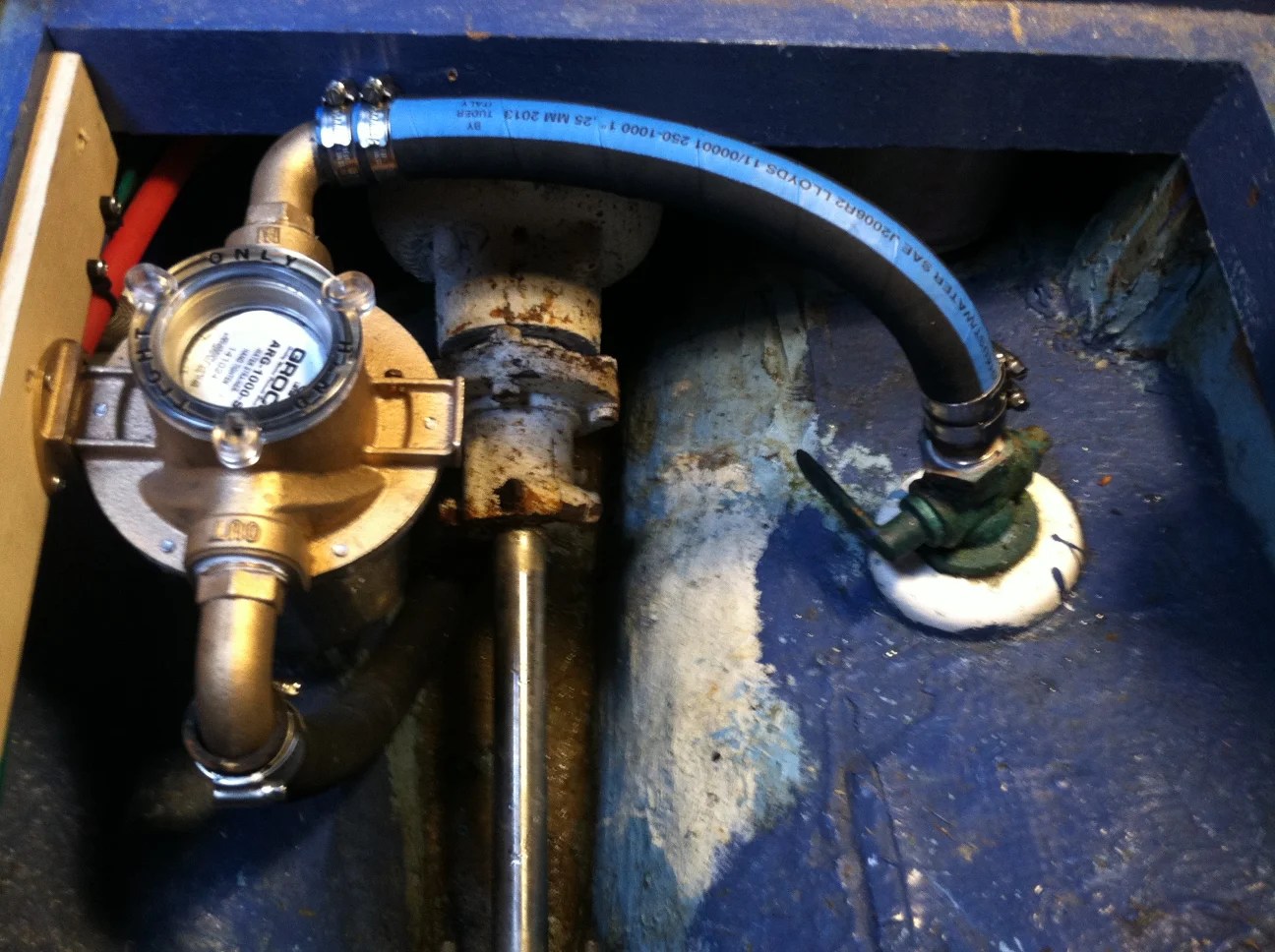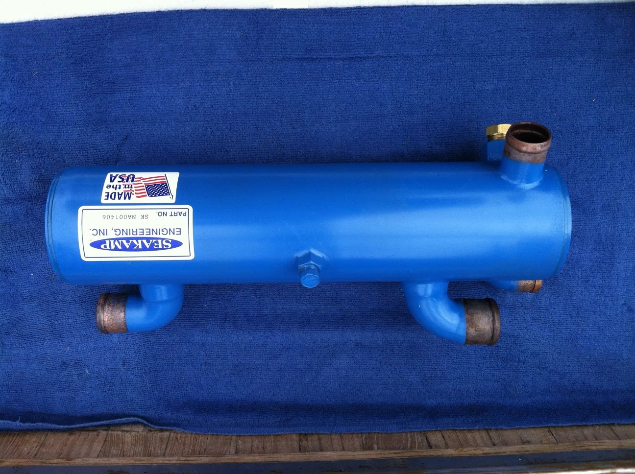 We upgraded the raw water strainer with a new Groco bronze unit, bronze full-flow pipe fittings, and new hoses from the seacock to the engine pump. Each hose also received double AWAB 316 stainless hose clamps.