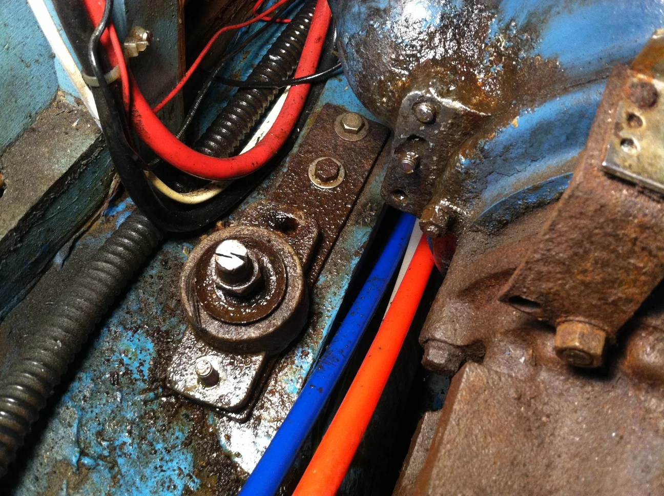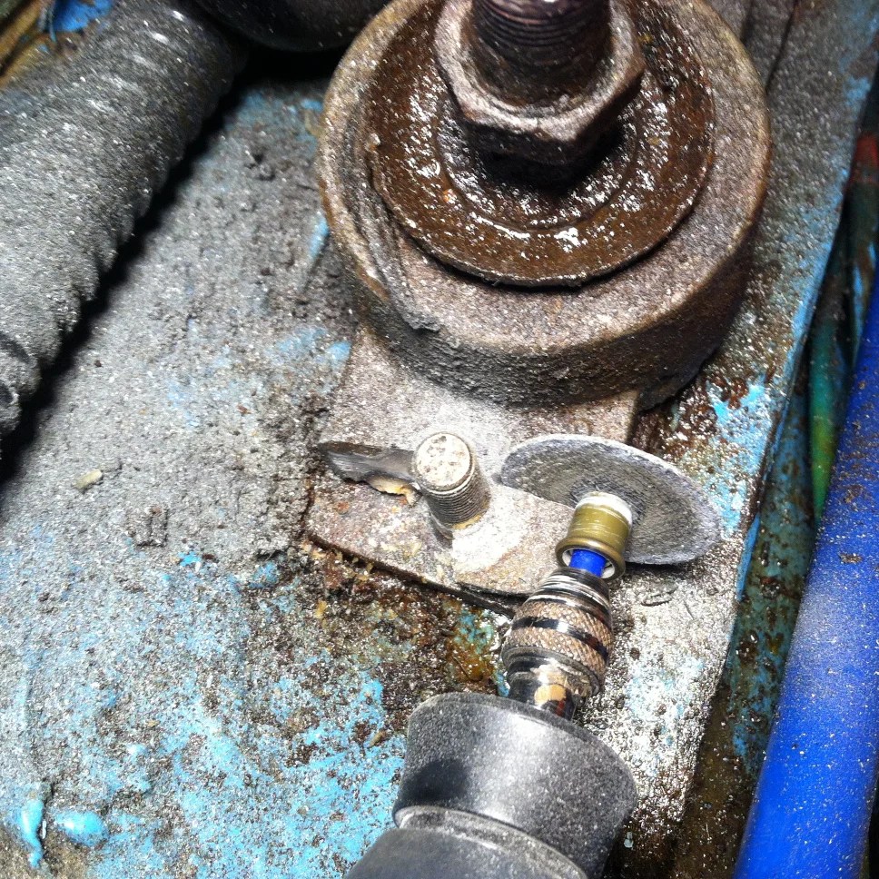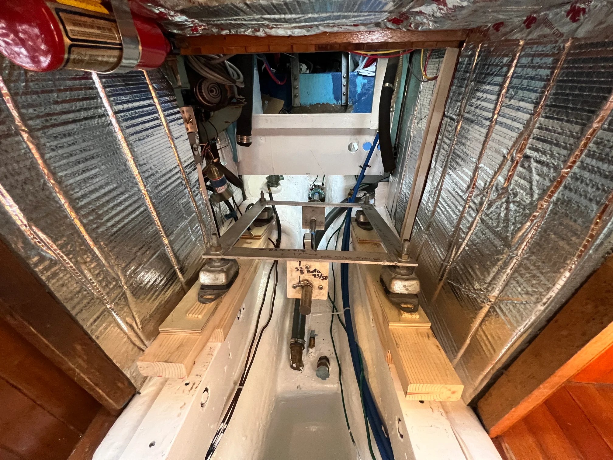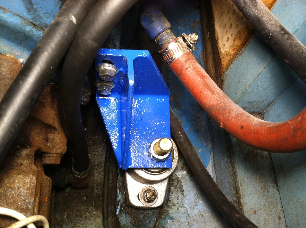 The heat exchanger at the back of the engine had corroded due to the previous owners not changing the zincs, and as a result, had been leaking salt water onto the port side engine mount. The steel engine bracket had nearly rusted away, and both rubber engine mount bushings were shot. Also, the bolts that secure the engine bracket were rusted off and I had to drill and tap new threads in the aluminum transmission case in order to fasten the newly fabricated bracket in place.