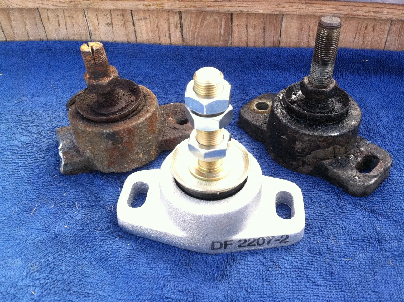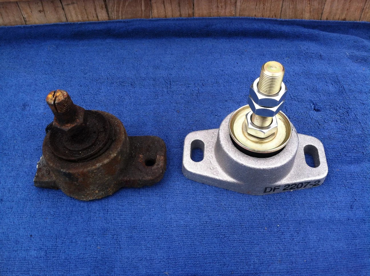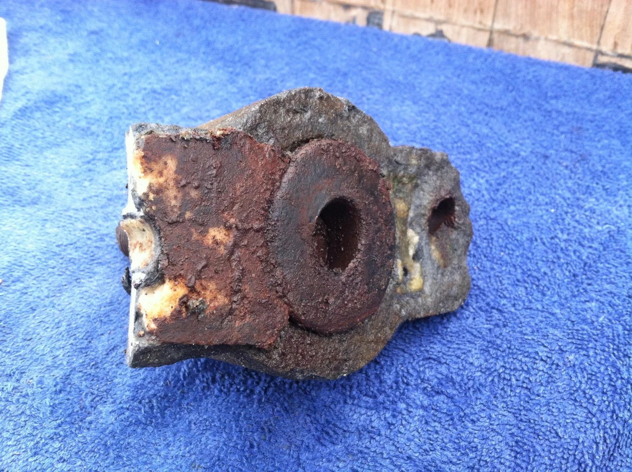 The heat exchanger at the back of the engine had corroded due to the previous owners not changing the zincs, and as a result, had been leaking salt water onto the port side engine mount. The steel engine bracket had nearly rusted away, and both rubber engine mount bushings were shot. Also, the bolts that secure the engine bracket were rusted off and I had to drill and tap new threads in the aluminum transmission case in order to fasten the newly fabricated bracket in place.