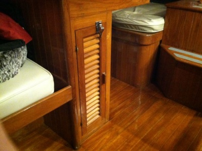 Phase I was to sand and paint the lockers inside the boat. They looked pretty dirty and would put splinters in your fingers. We insulated the back of some of the lockers where the hull is covered with vinyl with Prodex. We were hoping this would prevent condensation in the lockers and it has to an extent, but there is still some moisture in the lockers. We think we might want to modify some of the lockers or at least the access to some of them. The hatches to get into the back of the settees are really tight and we have an idea for a slide-out shelving unit we might try. All this will be Phase II, but depending on how all the other projects go, we might wag Phase II altogether. See cabinets and countertops for updates on improvements to storage.