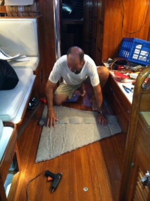 Ramble On came with a thin, moldy, dirty, and generally disgusting mattress. While I would have really liked to get a traditional mattress for the V-berth, they were too expensive so we ended up opting for a foam mattress. I searched the internet high and low for information on the “best” foam mattress for a boat. I had no idea there were so many options and choices in foam. Having no experience with foam mattresses I really wanted to try them out before making a final decision so online ordering was out. I finally found a place in San Francisco that makes custom mattresses so Rich and I traveled to Foam Order.com. They were great, very knowledgeable and helpful. We ended up ordering 4 inch Ever-flex medium-firm foam (density – 2.6 lb/ft3 and indentation load deflection (ILD) – 34) with a 2 inch memory foam (5.3 lb/ft3 ) top. Both layers are covered with medium weight fabric with zippers. There’s three pieces (right, left and the cutout) so we can still access the fuel tank and lower lockers.