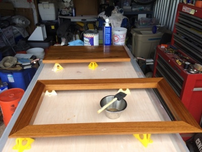 In the Spring of 2014 we started on the removal of the leaking teak decks over the V-berth and side decks. We popped out all the teak plugs, removed all the screws, and pried up each plank. The layer of black adhesive was scraped off and the fiberglass underneath sanded smooth. The screw holes were drilled out to verify the condition of the “balsa” core (ranging from soaking wet to bone dry), then filled temporarily with a thickened mix of epoxy to strengthen the outer fiberglass skin and keep any additional rain water out.
