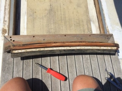We haven’t started dealing with the two overhead hatches, other than making a screen for the forward hatch to keep the bugs out and cutting 2-inch foam pieces for insulation. We’re not sure if they leak, but the glass is in bad shape. Ultimately we want to replace the lenses, re-bed the hatches and possibly encase the frames in fiberglass. This project is on the back burner for now.