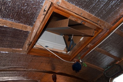 The Sacramento Delta is blessed with warm dry summers and cool mild winters. For the most part, the boat is comfortable without conditioning the air. Insulating the headliner has really helped too. But there were days in mid-July where it was unbearably hot down below. And now that it’s winter, it’s chilly and moist down below. We bought a cheap window AC unit for summertime and stick it in the aft overhead hatch. Rich fabricated a fancy cardboard duct so the air will flow all the way forward. It works great and we ran it only a few days.